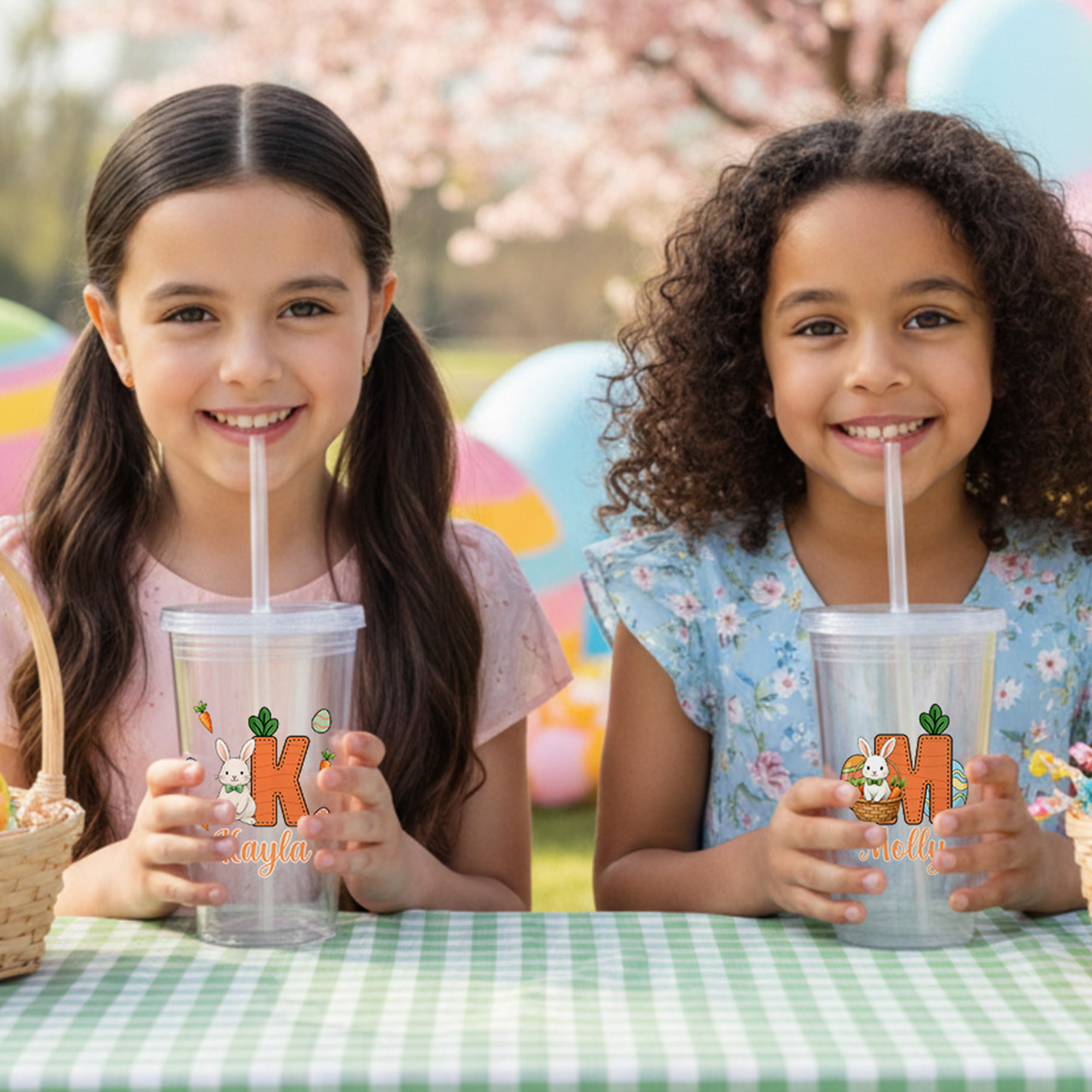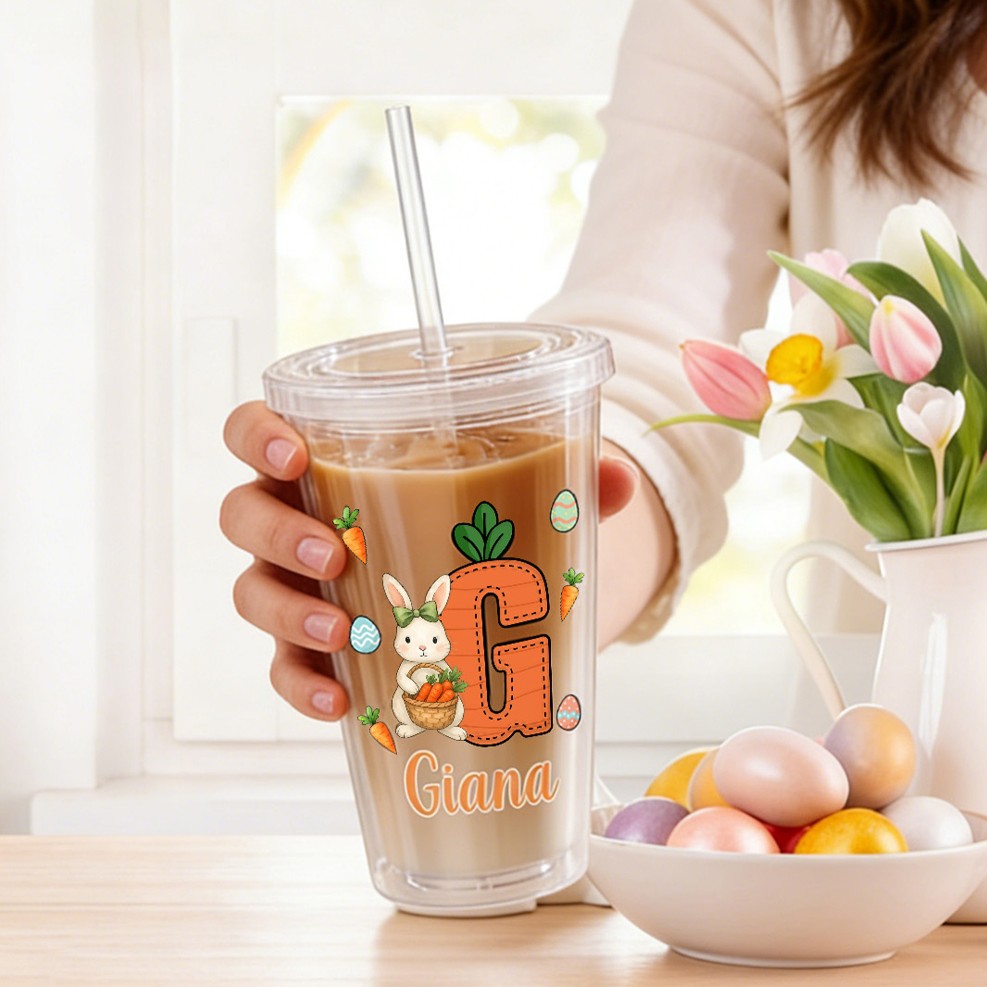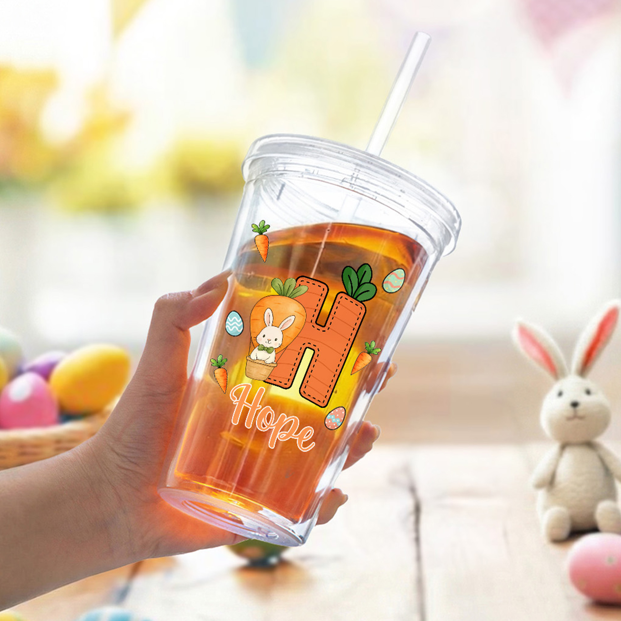 Personalized Name Cartoon Bunny & Carrot Alphabet Clear Tumbler with Straw, 16oz Kids' Cup, Easter Basket Stuffer, Easter Gift for Kids/Boys/Girls